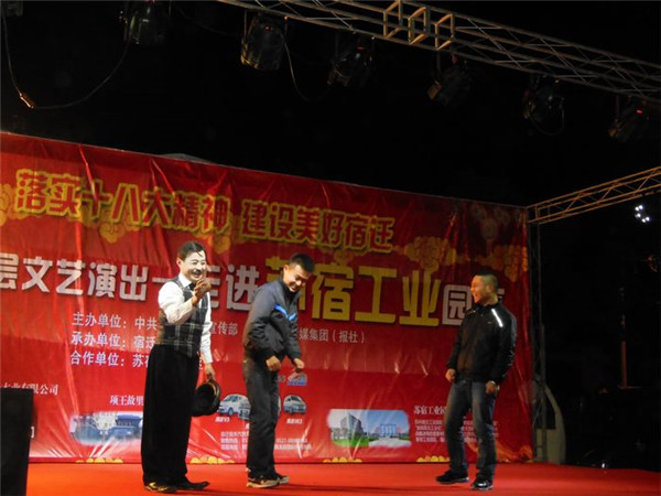 落實(shí)十八大精神 建設(shè)美好宿遷”服務(wù)基層文藝演出由市委宣傳部、宿遷報(bào)業(yè)傳媒集團(tuán)(報(bào)社)主辦,宿遷新聞網(wǎng)承辦,旨在深入宣傳黨的十八大和市委四屆三次全體(擴(kuò)大)會(huì)議精神,落實(shí)文化惠民措施,將走進(jìn)全市100余個(gè)鄉(xiāng)鎮(zhèn)、社區(qū),將包括歌舞、雜技、曲藝、戲劇等內(nèi)容的百場(chǎng)精彩演出奉獻(xiàn)給廣大基層群眾,此次受園區(qū)邀請(qǐng),專程赴園區(qū)公舍演出,為廣大工友及周邊居民帶來(lái)了一場(chǎng)精彩的文化大餐。