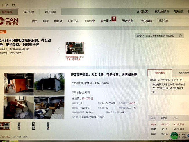 8月21日上午10時,城發(fā)公司報廢廚具、辦公設備、電子設備、鋼構棚子等物資網上拍賣開始,7家競買人,經過1小時44分10秒244次的緊張激烈競價,最終以228700元成交標的,比評估價90200元高出138500元,溢價率153.55%。
