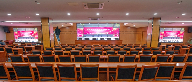 經(jīng)過(guò)改造,安全教育館新增3塊LED屏幕,其中主席臺(tái)處主LED顯示屏面積約20平方,東西兩側(cè)輔助LED顯示屏各約6平方。LED屏幕采用顯示單元像素間距為P2-2.5,具有顯示面積大、分辨率高、超高對(duì)比度、超寬視角、無(wú)縫拼接、維護(hù)方便等優(yōu)點(diǎn)。改造后進(jìn)一步提升了視頻會(huì)議效果,增加了會(huì)場(chǎng)多功能性。