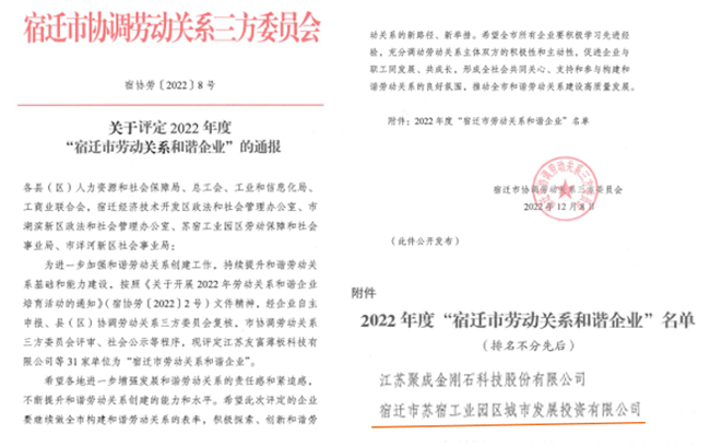 近日,園區(qū)城發(fā)公司獲評2022年度“宿遷市勞動關(guān)系和諧企業(yè)” 榮譽稱號。