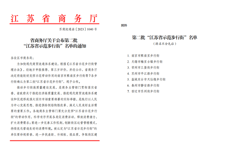 此次評定工作是根據(jù)《江蘇省示范步行街管理辦法》,由江蘇省商務(wù)廳集中組織第三方專家和評審員驗(yàn)收,先后經(jīng)過上報(bào)資料、專家審核、實(shí)地考察、全省評比等方式確定7條江蘇省示范街區(qū)步行街。